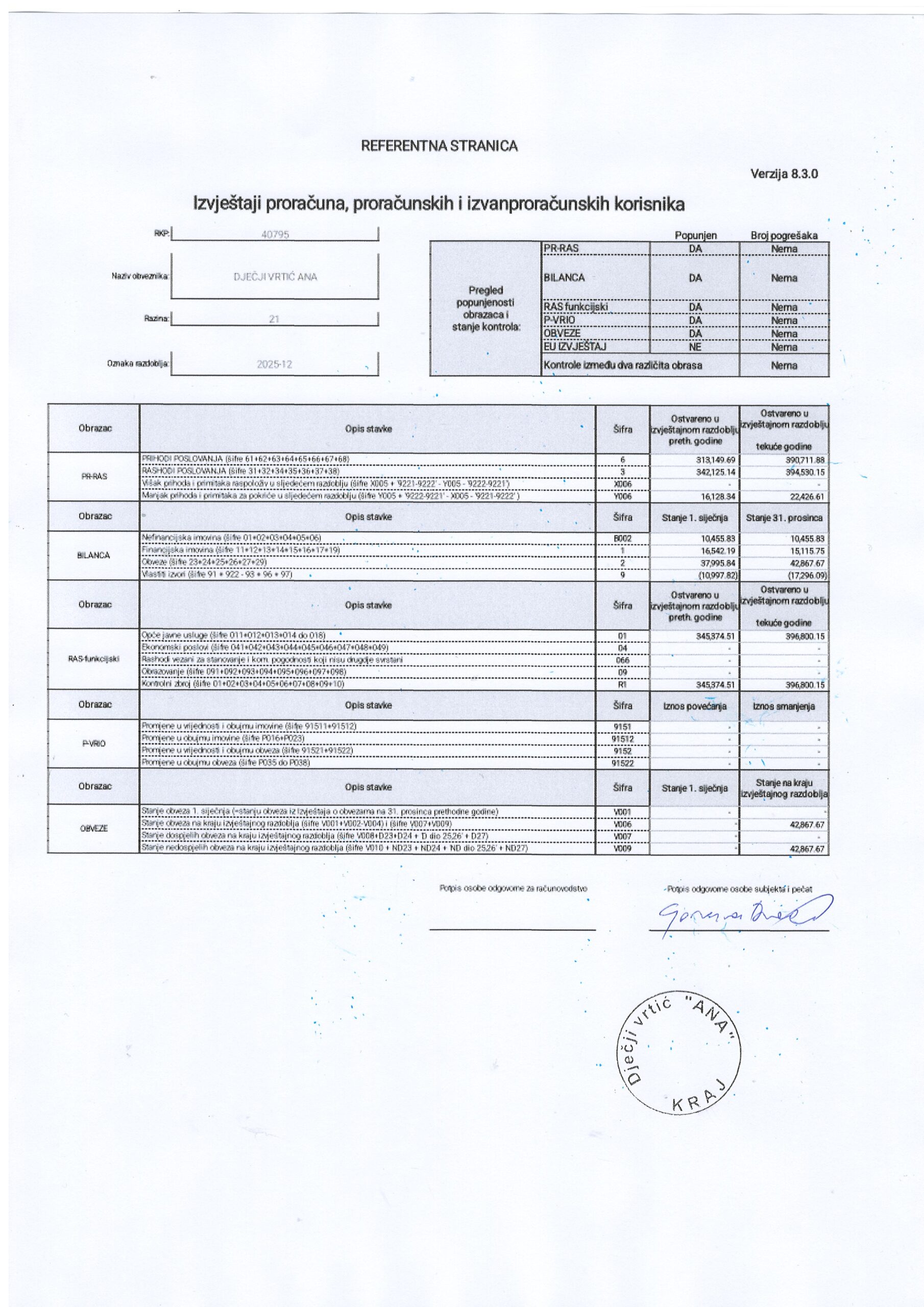 Izvještaji proračuna, proračunskih i izvanproračunskih korisnika; Izvještaj o prihodima i rashodima, primicima i izdacima; Bilanca; Izvještaj o rashodima prema funkcijskoj klasifikaciji; Izvještaj o obvezama za 2025