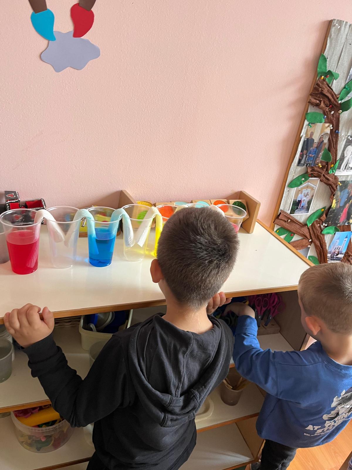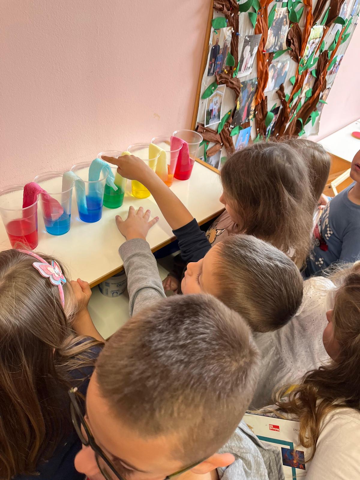 - nastajanje boja (koršteni materijali: plastične čaše, kuhinjski papir, prehrambene boje, voda)
