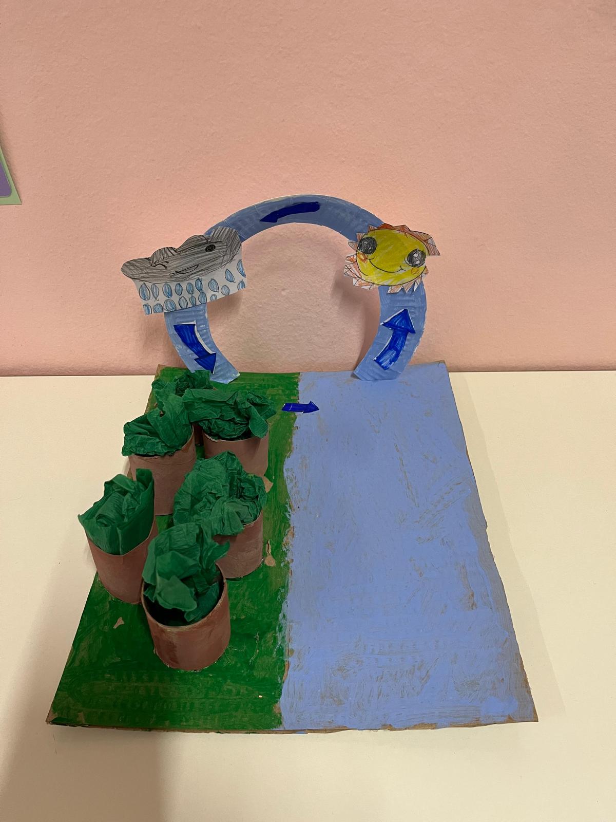 - izrada hidrološkog ciklusa – upoznavanje procesa kruženja vode u prirodi (korišteni materijali: karton, kartonski tuljci, papirnati tanjuri, krep papir, tempere)