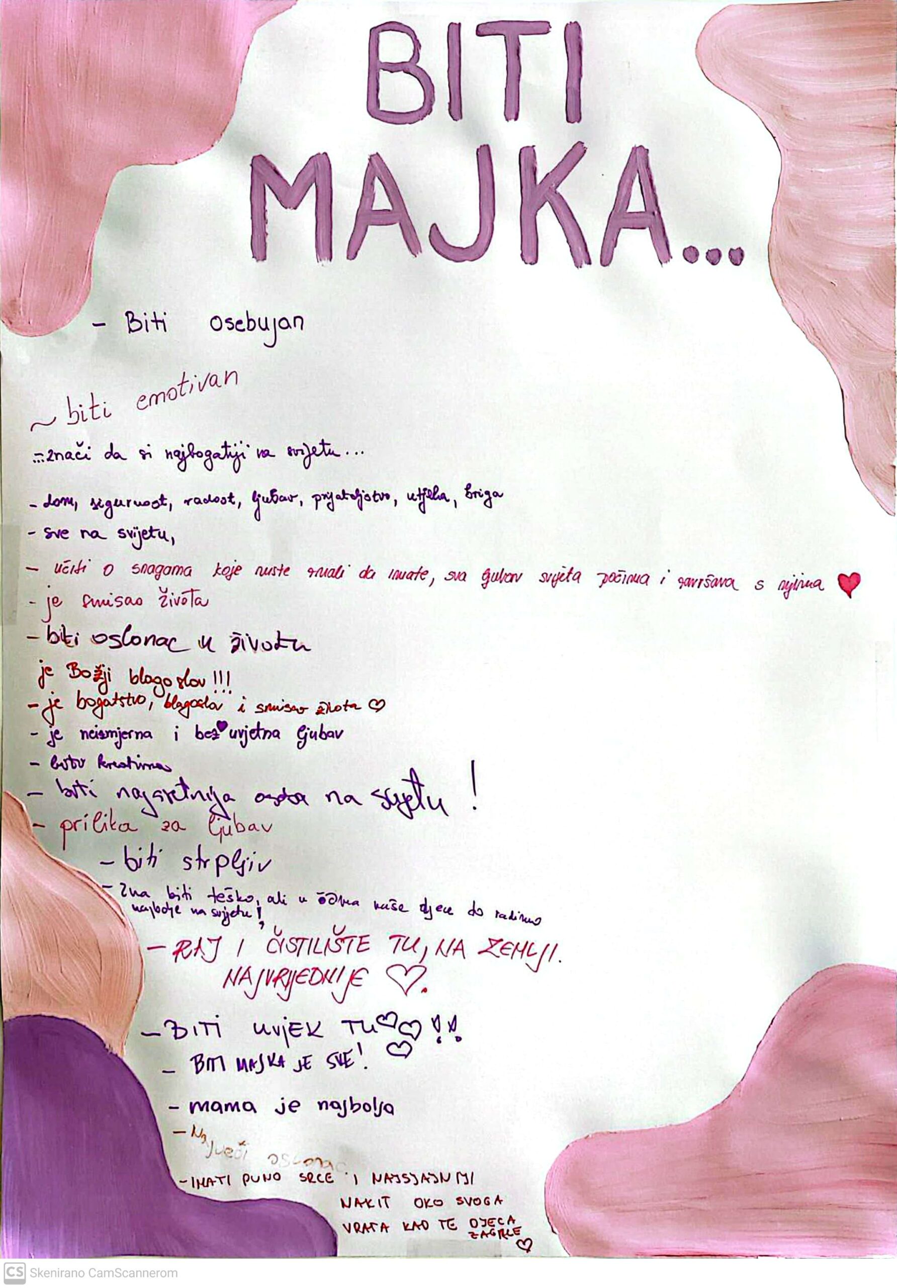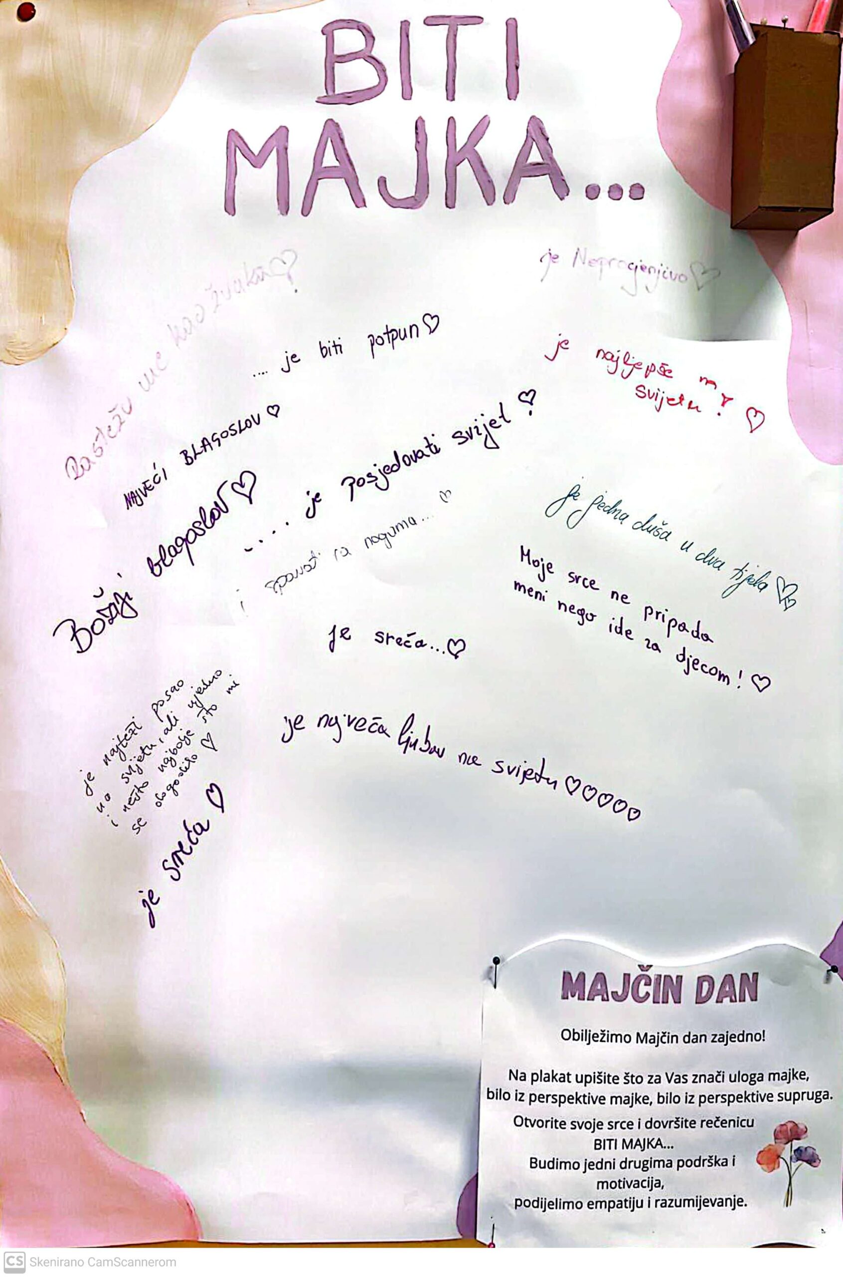 Osim prigodnih aktivnosti u odgojnim skupinama, proveli smo i aktivnost u kutku za roditelje. Roditelji su mogli nastaviti rečenicu “Biti majka…” kako bi izrazili svoje viđenje uloge majke, podijelili razumijevanje, empatiju i pokoju lijepu riječ ohrabrenja. Što se sve moglo naći na našim plakatima, pogledajte u nastavku.